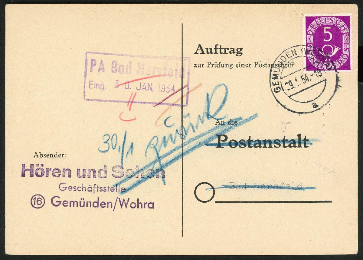 | Zusatzinformationen und Suchstichworte: | Klüttermann - 6. Auktion 27. Juli - 4. August 2023 Los 7868 Bundesrepublik Deutschland 5 Pfg. Posthorn als seltene portogerechte EF auf tadelloser Anschriftenprüfkarte 29.1.54, FA Schlegel Ausruf 170,00 EUR |