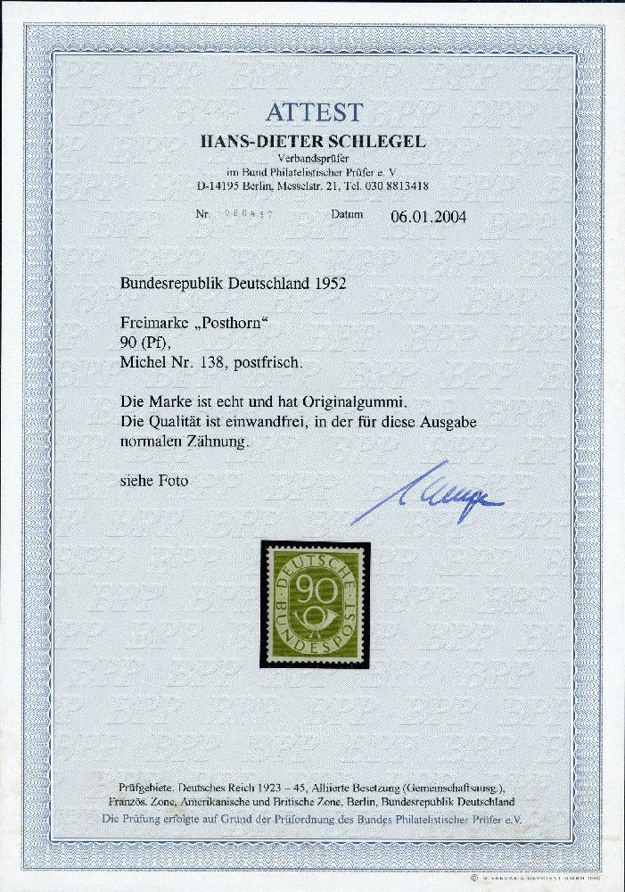 | Zusatzinformationen und Suchstichworte: | Klüttermann - 6. Auktion 27. Juli - 4. August 2023 Los 7914 Bundesrepublik Deutschland 90 Pfg. Posthorn, tadellos postfr. mit FA Schlegel "einwandfrei, normale Zähnung" Ausruf 100,00 EUR |