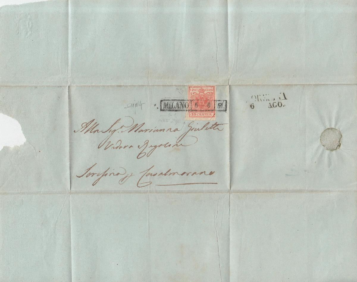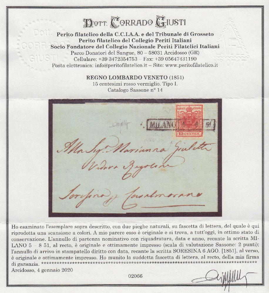 | Zusatzinformationen und Suchstichworte: | Versuch einer Übersetzung: KÖNIGREICH LOMBARDO VENETO (1851) 15 Centesimi zinnoberrot. Typ I. Sassone Katalog Nr. 14 Ich habe das oben beschriebene Exemplar mit zwei natürlichen Falten auf einem Faltbrief untersucht, von dem hier ein Farbscan reproduziert wird. Meiner Meinung nach ist es original und befindet sich noch in einem hervorragenden Erhaltungszustand. Der rechteckige Aufgabestempel mit Datum und Jahr, Inschrift MILANO 5 - 8 51 auf der Vorderseite ist original und sehr gut abgeschlagen (Sassone-Bewertungsskala: 2 Punkte); die Ankunftsstempel in Großbuchstaben mit Datum mit der Inschrift SORESINA 6 AGO. [1851] auf der Rückseite ist original und hervorragend abgeschlagen. Ich habe den oben genannten Brief mit Signatur auf der Vorderseite versehen. Arcidosso, 4. Januar 2020 |