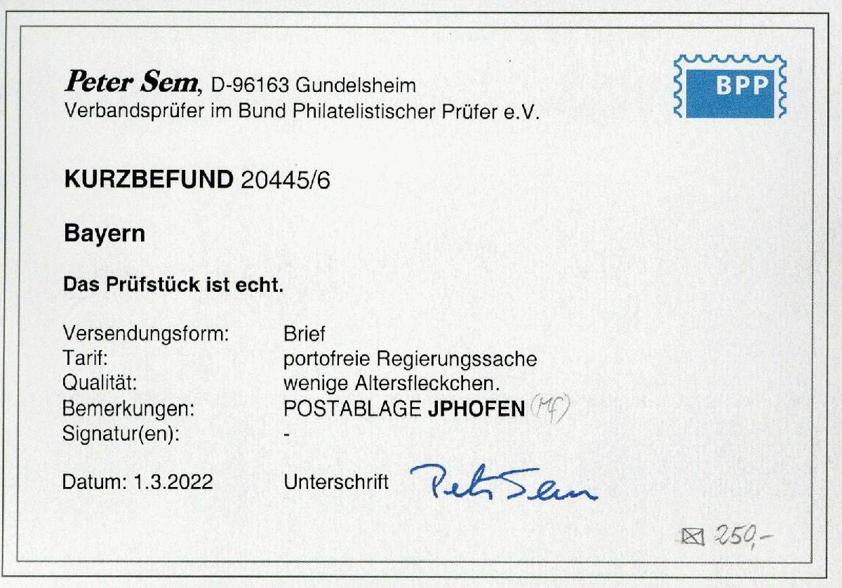 | Zusatzinformationen und Suchstichworte: | Veuskens 121. Auktion 10. - 11. August 2023 Los 745 Altdeutschland Bayern Postablage Jphofen: idealer, schwarzer L2. auf portofreier Regierungssache über Mainbernheim nach Wüstenfelden, Farbfotokurzbefund Sem BPP, Pracht Ausruf 35,00 EUR |