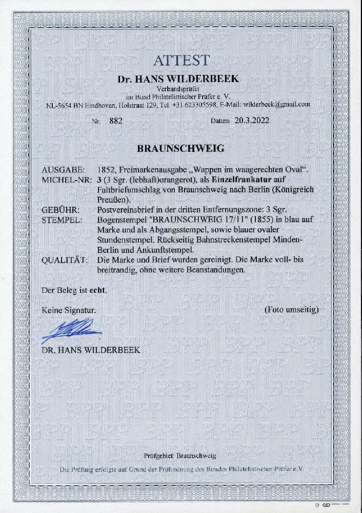 | Zusatzinformationen und Suchstichworte: | Veuskens 121. Auktion 10. - 11. August 2023 Los 778 Altdeutschland Braunschweig 3 Sgr. orangerot 1852, farbfrisch und allseits voll- bis breitrandig auf Faltbriefhülle vom 17.11.1855 nach Berlin, mit Braunschweiger Bogenstpl. sowie nebengesetztem Stundenstpl. Rs. mit Bahn-L3. 'Minden/Berlin' sowie Ak.-Stpl., ausführl., neues Farbfotoattest Wilderbeek 'Die Marke und Brief wurden gereinigt, ohne weitere Beanstandungen'. M€ 1.200,-- Ausruf 250,00 EUR |