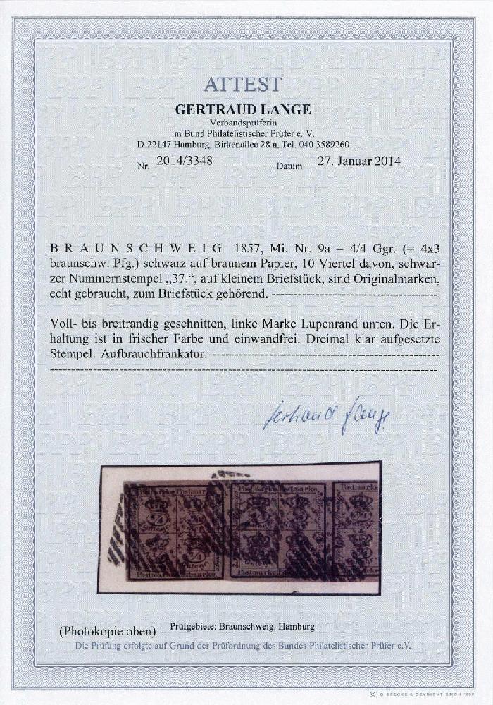 | Zusatzinformationen und Suchstichworte: | Veuskens 121. Auktion 10. - 11. August 2023 Los 791 Altdeutschland Braunschweig 10/4 Ggr. 1857, in a.-Farbe, auf Briefstück, mit Nrn.-Stpl. '37', die linke Marke unten Lupenrand, sonst allseits voll- bis breitrandig und farbfrisch, Farbfotoattest Lange BPP. M€ 600,-- Ausruf 120,00 EUR |