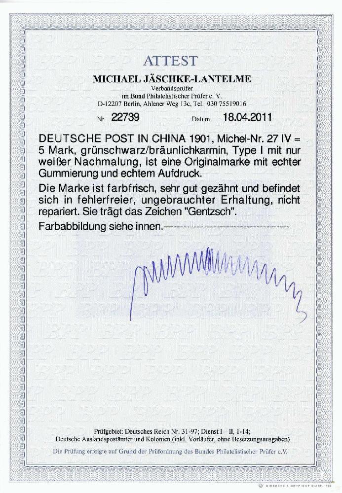 | Zusatzinformationen und Suchstichworte: | Veuskens 121. Auktion 10. - 11. August 2023 Los 1380 Deutsche Auslandspost China 5 Mark Germania REICHSPOST 1900, mit waager. Aufdruck 'China', in Type IV. (Nachmalung nur mit Deckweiß), sauber ungebraucht, sig. Gentzsch und Farbfotoattest Jäschke-Lantelme BPP 'farbfrisch, sehr gut gezähnt, in einwandfreier, ungebrauchter Erhaltung', Pracht. M€ 600,-- Ausruf 150,00 EUR |