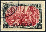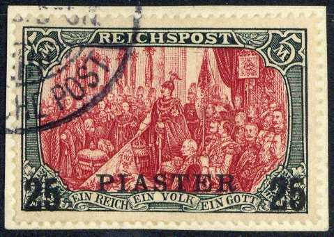 | Zusatzinformationen und Suchstichworte: | Veuskens 121. Auktion 10. - 11. August 2023 Los 1421 Deutsche Auslandspost Türkei 25 Pia. auf 5 Mark Germania REICHSPOST 1900, in Type II., auf kl. Briefstück, mehrfach sig. und Farbfotoattest Jäschke-Lantelme BPP 'farbfrisch, gut gezähnt, in fehlerfreier, gebrauchter Erhaltung', Pracht. M€ 550,-- Ausruf 130,00 EUR |