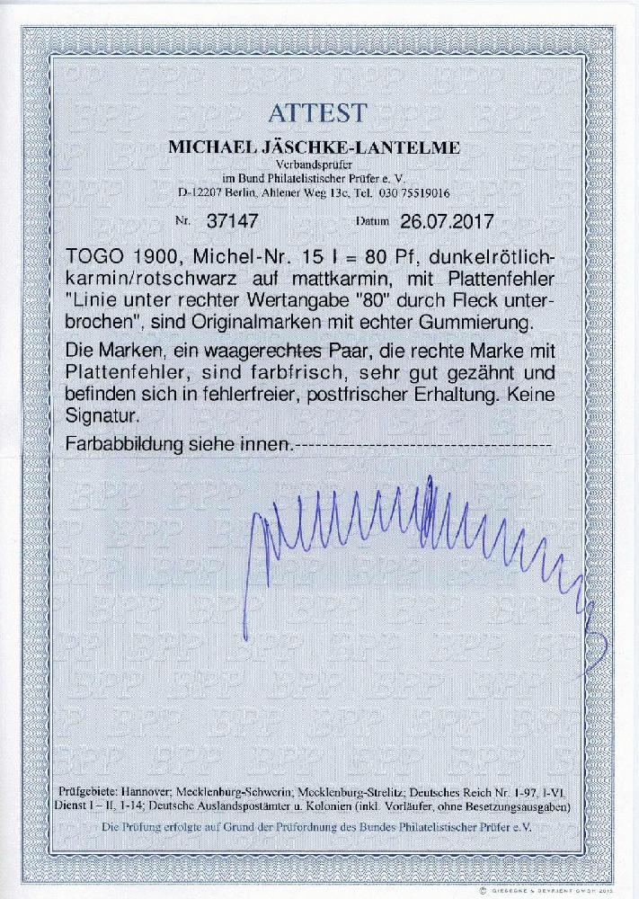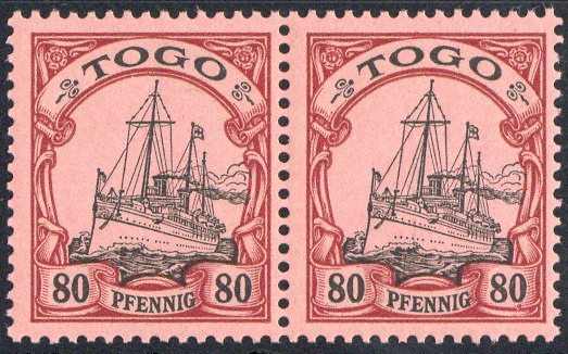 | Zusatzinformationen und Suchstichworte: | Veuskens 121. Auktion 10. - 11. August 2023 Los 1521 Deutsche Kolonien Togo 80 Pf. Schiffszeichnung 1900, mit markanter Abart 'Linie der unteren, rechten Wertangabe 80 durch Fleck unterbrochen', waager. Paar mit Normalmarke, tadellos postfrisch, ausführl. Farbfotoattest Jäschke-Lantelme 'echt und einwandfrei'. M€ 600,-- Ausruf 150,00 EUR |