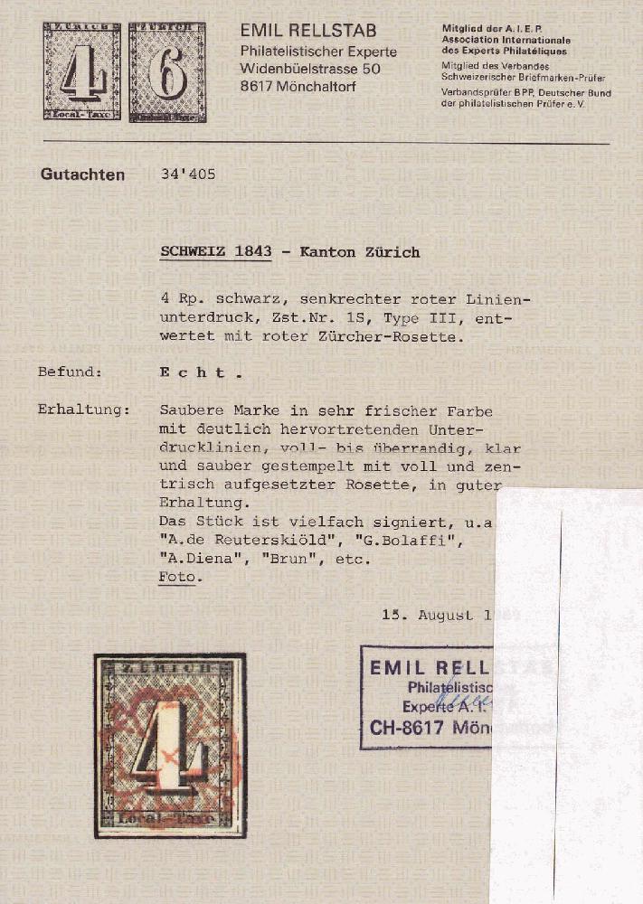 | Zusatzinformationen und Suchstichworte: | 44. Jean-Paul Bach Auktion 13. - 16. Juli 2023 Los 761 Schweiz Kanton Zürich Type III, farbfrisch und allseitig vollrandig, deutliche Unterdrucklinien, ideale ZÜRCHER-Rosette, fehlerfreie Erhaltung. Sign. Reuterskiöld, Bolaffi, Diena und Attest Rellstab Ausruf 13.000,00 CHF |