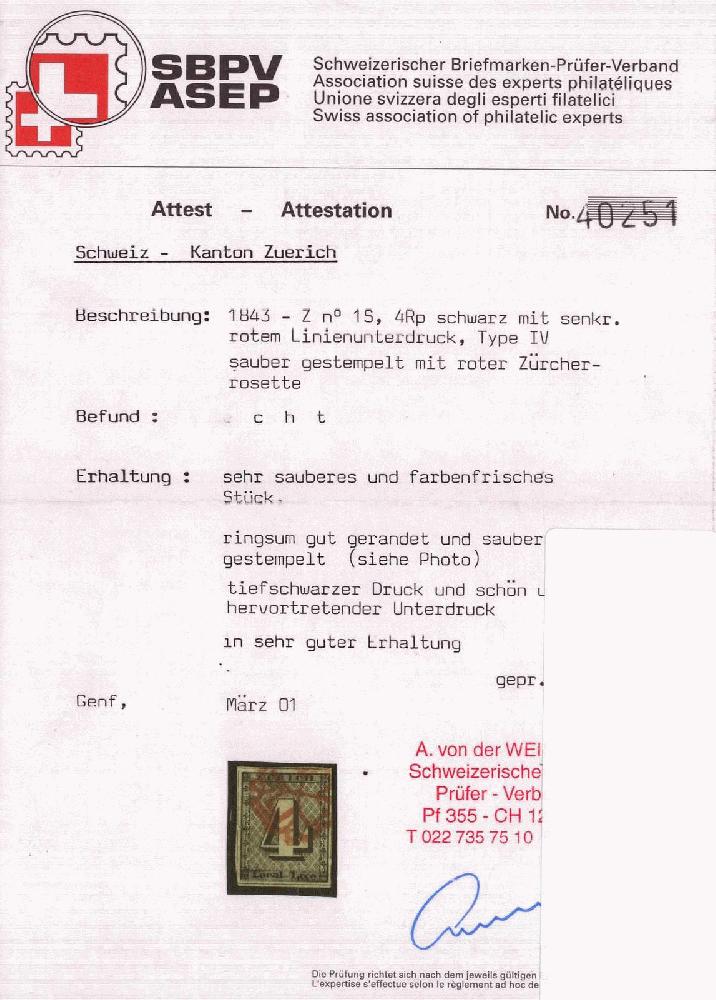 | Zusatzinformationen und Suchstichworte: | 44. Jean-Paul Bach Auktion 13. - 16. Juli 2023 Los 764 Schweiz Kanton Zürich Type IV, sehr farbfrisch und allseitig vollrandig, deutliche Unterdrucklinien, saubere, rote ZÜRCHER-Rosette, fehlerfreie Erhaltung. Attest von der Weid Ausruf 15.000,00 CHF |