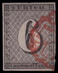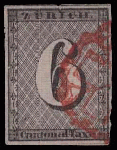 | Zusatzinformationen und Suchstichworte: | 44. Jean-Paul Bach Auktion 13. - 16. Juli 2023 1843, ZÜRICH 6 RP., WAAGERECHTER UNTERDRUCK Type II, 52. Bogenfeld, farbfrisch, voll- bis überrandig, saubere, rote ZÜRCHER-Rosette, bis auf Bugspur eine schöne Marke, in guter Erhaltung. Attest Berra. Kat. 2'300.- Ausruf 500,00 CHF |