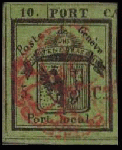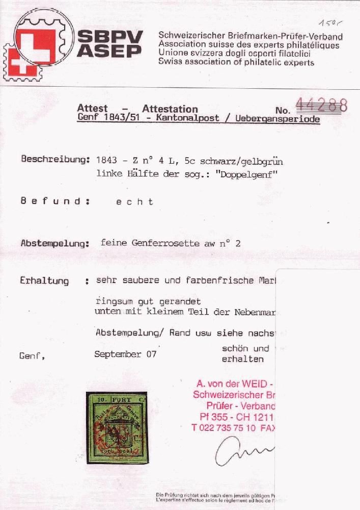 | Zusatzinformationen und Suchstichworte: | 44. Jean-Paul Bach Auktion 13. - 16. Juli 2023 Los 796 Schweiz Kanton Genf Doppelgenf, linke Hälfte, sehr farbfrisch und allseitig breite Ränder, unten mit Teil der Nebenmarke, saubere rote GENFER-Rosette (AW Nr. 2), fehlerfreie Erhaltung. Attest von der Weid und American Philatelic Society. Kat. 10'000.- Ausruf 5.400,00 CHF |