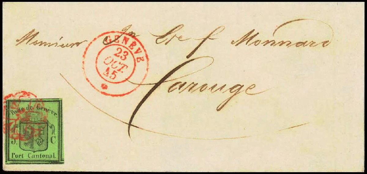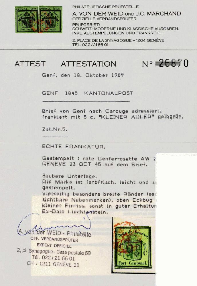 | Zusatzinformationen und Suchstichworte: | 44. Jean-Paul Bach Auktion 13. - 16. Juli 2023 Los 808 Schweiz Kanton Genf Besonders farbfrisch, saubere, rote GENFER-Rosette (AW2), auf den frischen Brief übergehend, oben winziger Einriss und minimes Eckbüglein, die wohl breitrandigste Marke, die auf Brief existiert, Sechs sichtbare Nebenmarken, sauberer Datum-Stempel GENEVE 23 OCT 45, soweit in guter Erhaltung und von enormer Wirkung und Präsentation. Ein Brief für die bedeutende Ausstellungssammlung. Ex-Dale Liechtenstein. Attest von der Weid (1989) Ausruf 5.000,00 CHF |