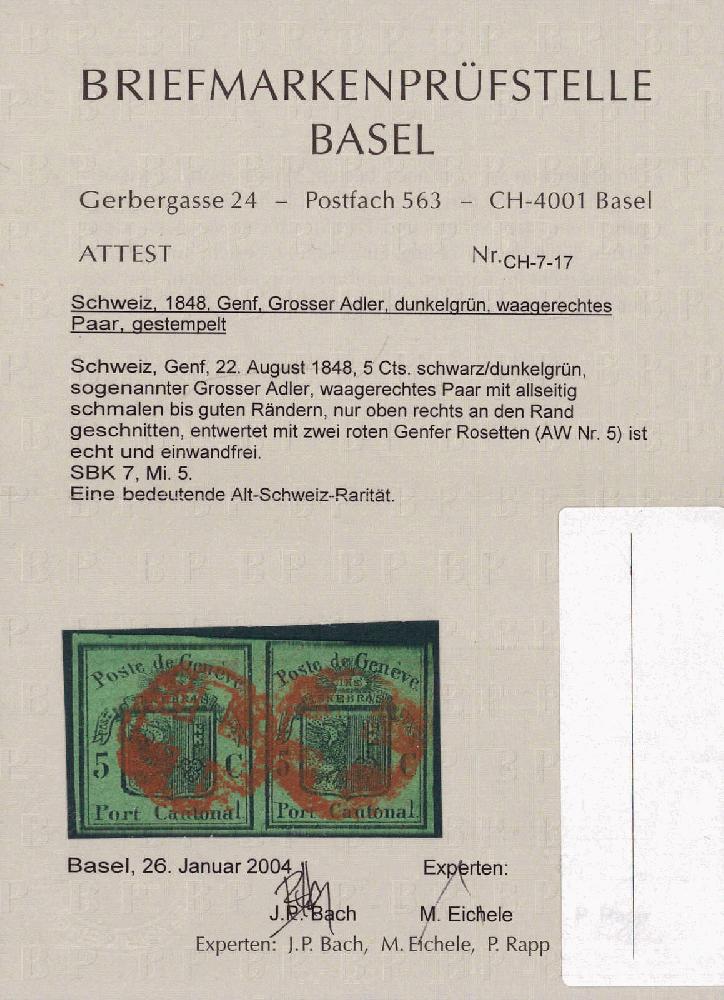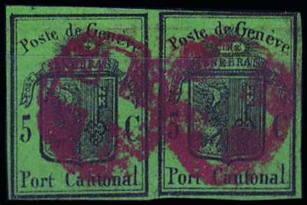 | Zusatzinformationen und Suchstichworte: | 44. Jean-Paul Bach Auktion 13. - 16. Juli 2023 Los 821 Schweiz Kanton Genf Sehr farbfrisches, waagerechtes Paar mit 2 zentrisch, aufgesetzten, roten GENFER-Rosetten (AW Nr. 5), rechts oben schmal, sonst breit gerandet, eine bedeutende Alt-Schweiz-Rarität in guter Erhaltung. Attest BP Ausruf 10.000,00 CHF |