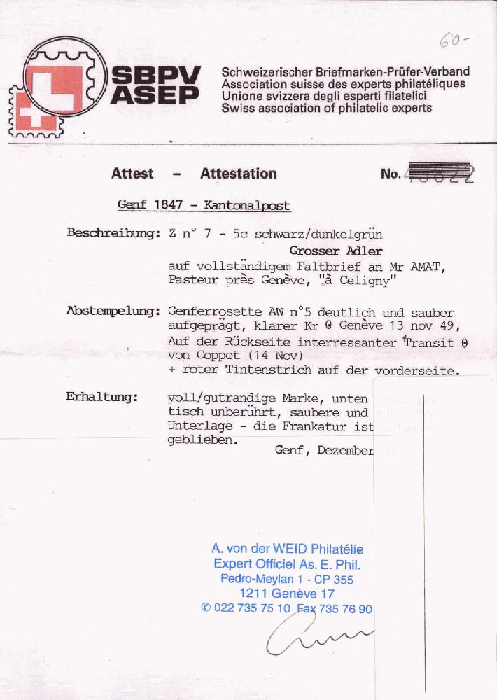 | Prüfer: | von der Weid, Alain (SBPV / ASEP (Schweizerischer Briefmarken-Prüfer-Verband)) |