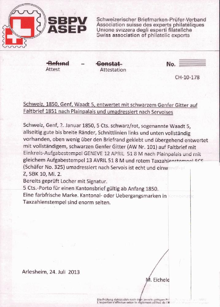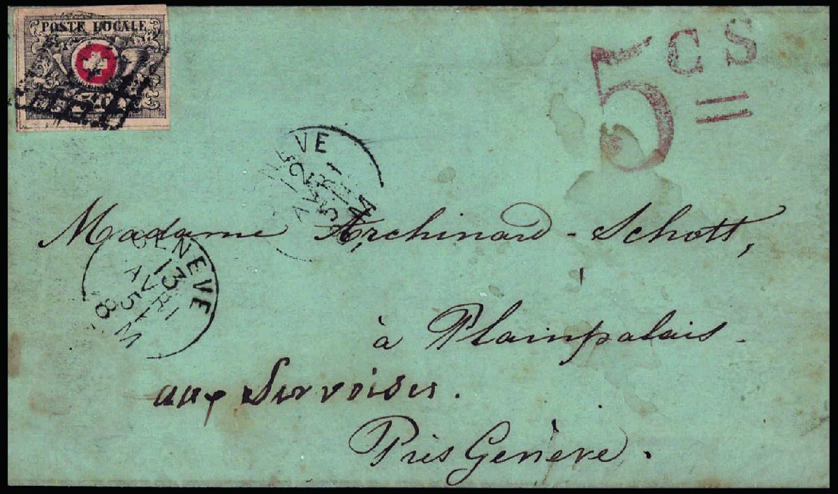 | Zusatzinformationen und Suchstichworte: | 44. Jean-Paul Bach Auktion 13. - 16. Juli 2023 Los 863 Schweiz Übergangszeit, Waadt, Neuenburg, Winterthur Farbfrisch und vollrandig, zentrische, GENFER Gitterraute (AW Nr. 101), auf den Brief übergehend, schwarzer Aufgabestempel GENEVE 12 AVRIL 51 und 13 AVRIL 51, rechts mit dem roten Taxzahlstempel "5 cs" (Schaefer Nr. 325), nach SERVOIS umadressiert. Eine besonders seltene Kombination von einer Übergangsmarke mit einem Taxzahlstempel. Fehlerfreie Erhaltung. Attest Eichele Ausruf 25.000,00 CHF |