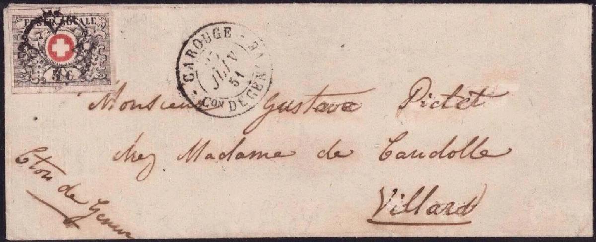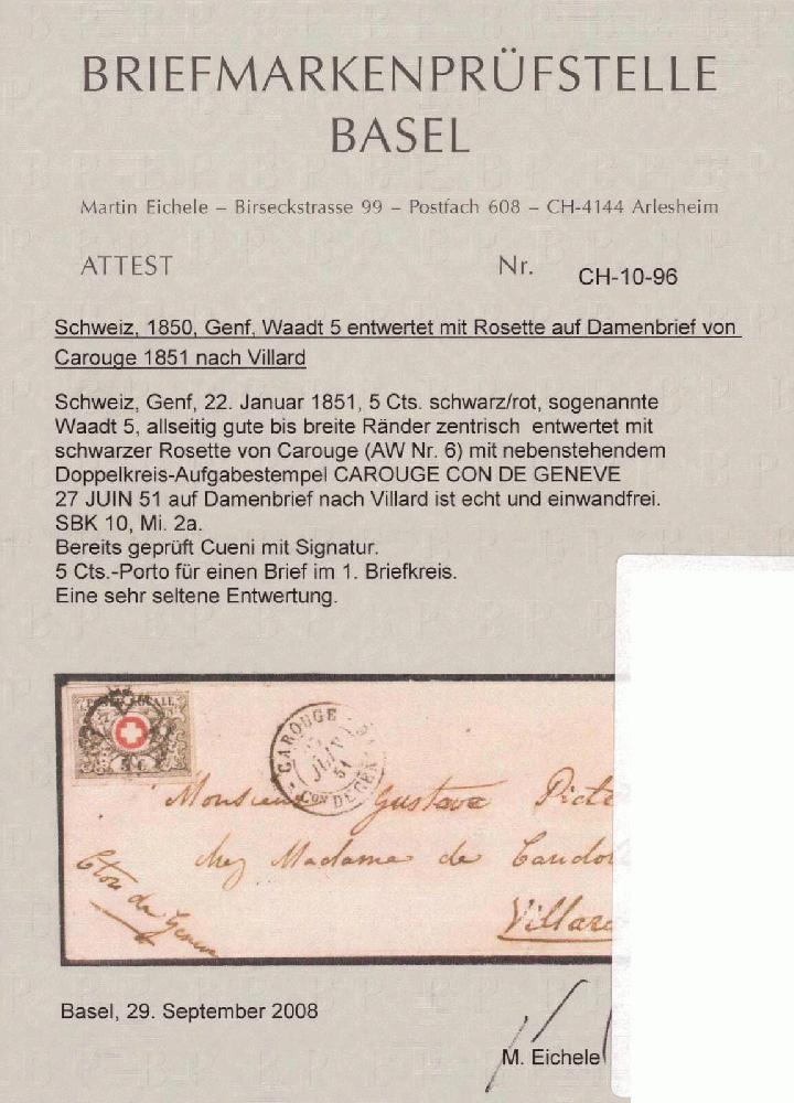 | Zusatzinformationen und Suchstichworte: | 44. Jean-Paul Bach Auktion 13. - 16. Juli 2023 Los 865 Schweiz Übergangszeit, Waadt, Neuenburg, Winterthur Farbfrisch, allseitig vollrandig, entwertet mit der seltenen, schwarzen Rosette von CAROUGE (AW Nr. 6), daneben der Aufgabestempel CAROUGE CON DE GENEVE 27 JUIN 51, schöner Damenbrief nach VILLARD adressiert, fehlerfreie Erhaltung. Sign. Cueni und Attest Eichele Ausruf 10.000,00 CHF |