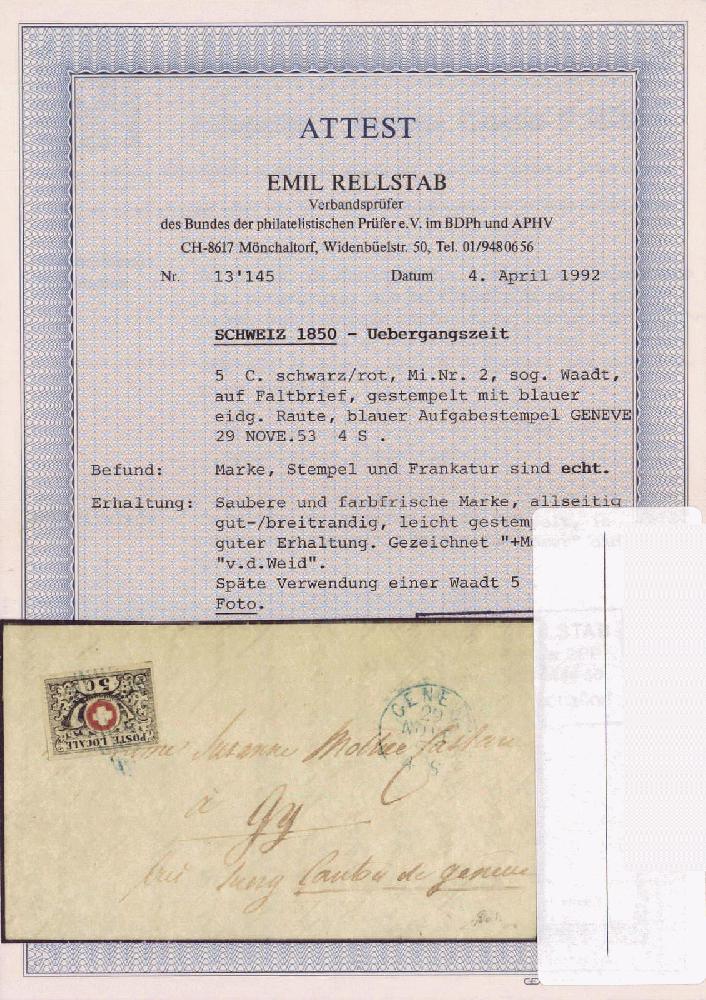 | Zusatzinformationen und Suchstichworte: | 44. Jean-Paul Bach Auktion 13. - 16. Juli 2023 Los 869 Schweiz Übergangszeit, Waadt, Neuenburg, Winterthur Sehr farbfrisch, allseitig vollrandig, schöne, blaue eidgenössische Raute, auf den Brief übergehend, späte Verwendung der Waadt 5, selten und fehlerfrei. Sign. Moser, von der Weid und Attest Rellstab Ausruf 8.000,00 CHF |