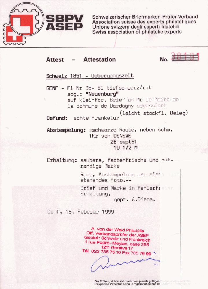 | Prüfer: | von der Weid, Alain (SBPV / ASEP (Schweizerischer Briefmarken-Prüfer-Verband)) |