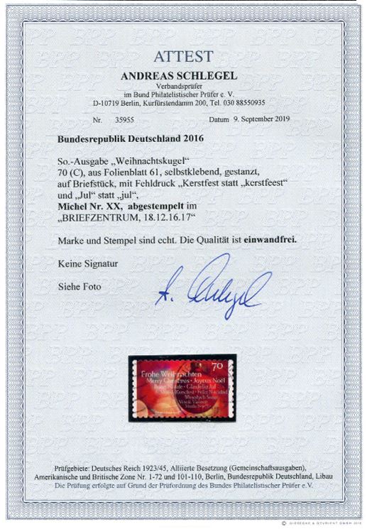 | Prüfer: | Schlegel, Andreas (BPP (Bund Philatelistischer Prüfer)) |