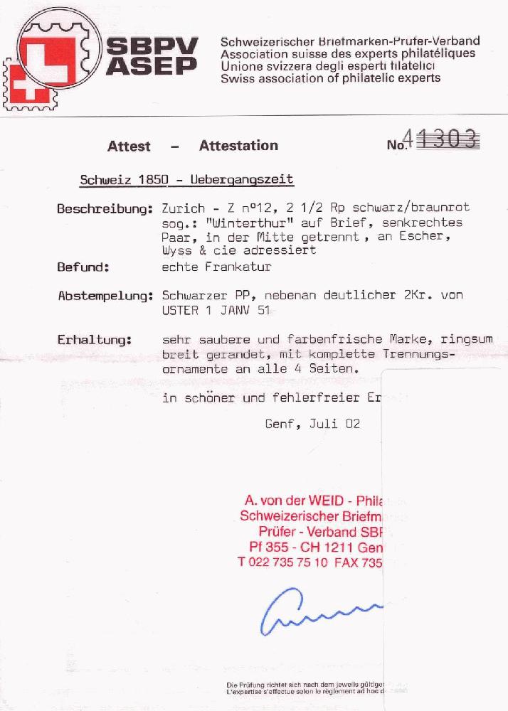 | Prüfer: | von der Weid, Alain (SBPV / ASEP (Schweizerischer Briefmarken-Prüfer-Verband)) |