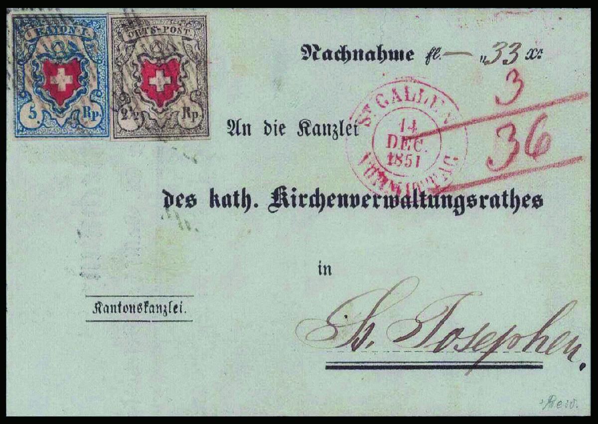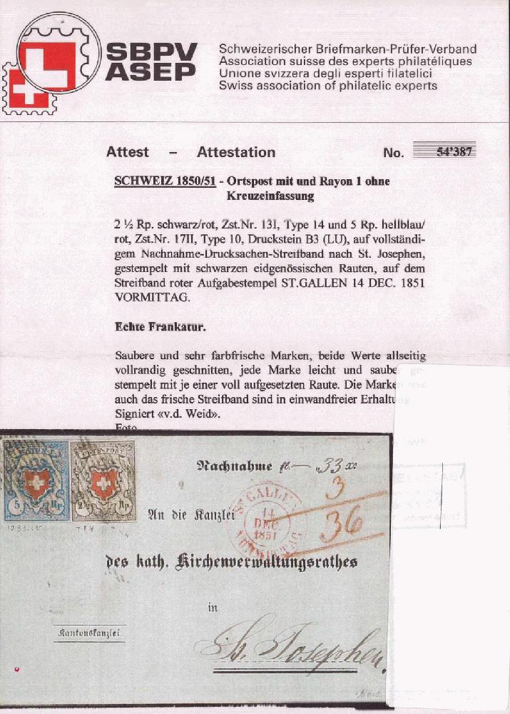 | Zusatzinformationen und Suchstichworte: | 44. Jean-Paul Bach Auktion 13. - 16. Juli 2023 Los 902 Schweiz Orts-Post, Poste Locale Typen 14, Orts-Post und Rayon I, Type 10, B3 (LU), schöne Mischfrankatur, beide Marken regelmässig vollrandig, saubere eidg. Rauten auf die schöne Nachnahme übergehend, roter Aufgabestempel ST. GALLEN 14 DEC 1851 VORMITTAG, tadellose Luxus-Erhaltung. Sign. von der Weid, Attest Rellstab Ausruf 7.000,00 CHF |