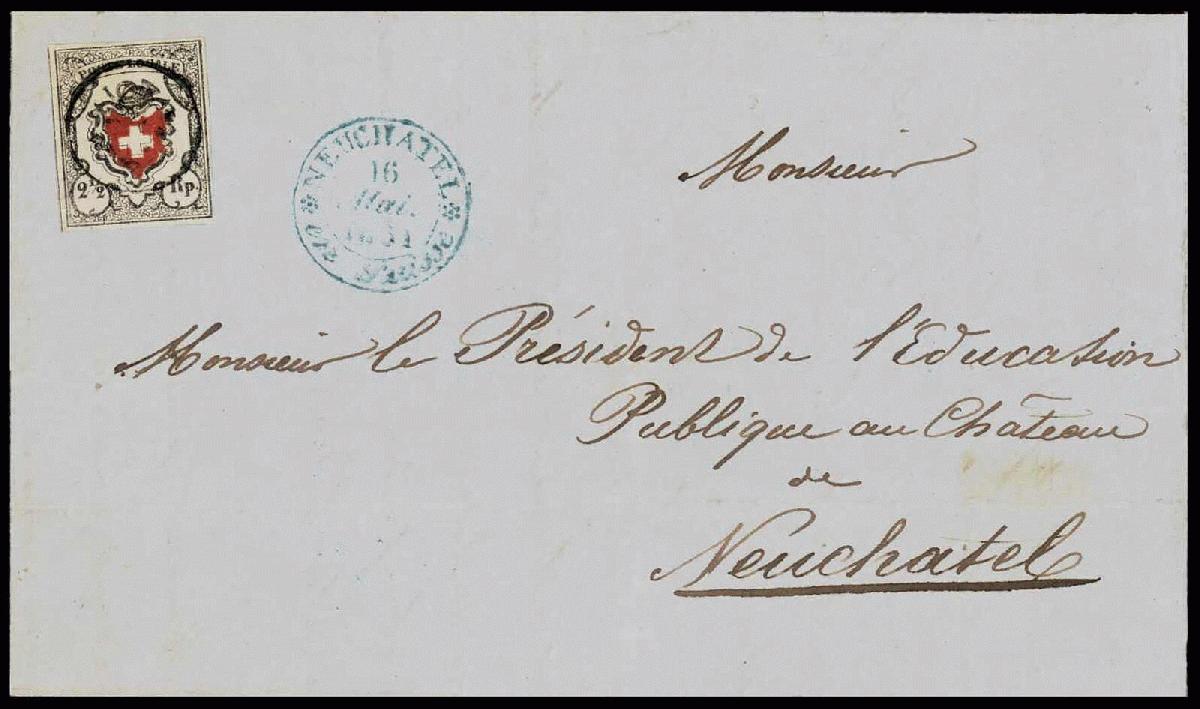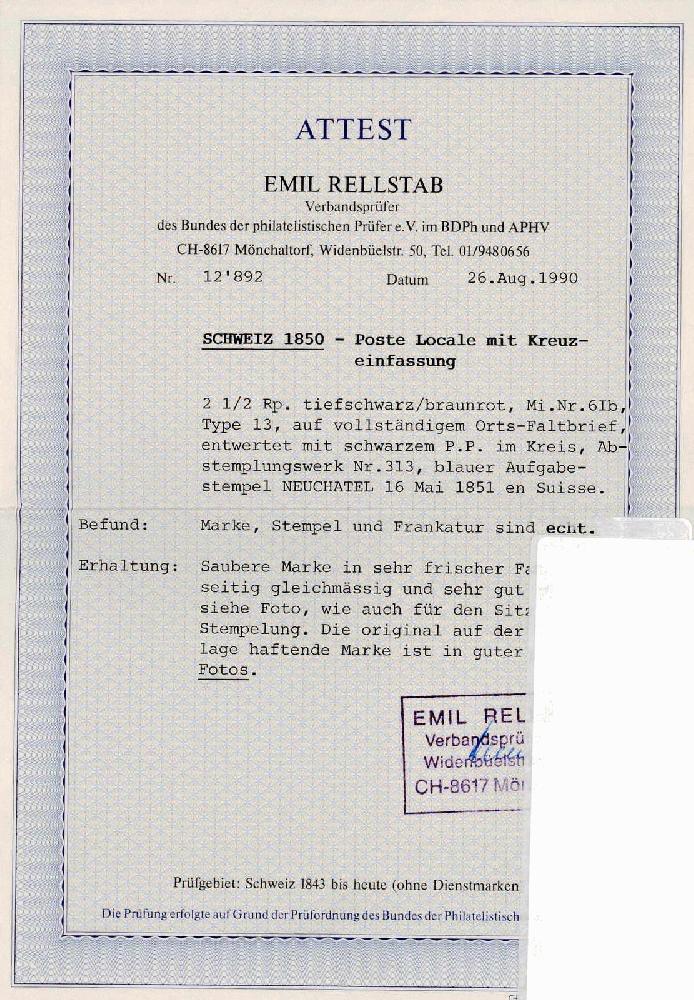 | Zusatzinformationen und Suchstichworte: | 44. Jean-Paul Bach Auktion 13. - 16. Juli 2023 Los 912 Schweiz Orts-Post, Poste Locale Type 3, besonders farbfrisch, allseitig regelmässig breitrandig, zentrisches schwarzes P.P: im Kreis (AW Nr. 313), sauberer, blauer Aufgabestempel NEUCHATEL 16 MAI 1851 en SUISSE. Tadellose Erhaltung. Attest Rellstab Ausruf 3.200,00 CHF |