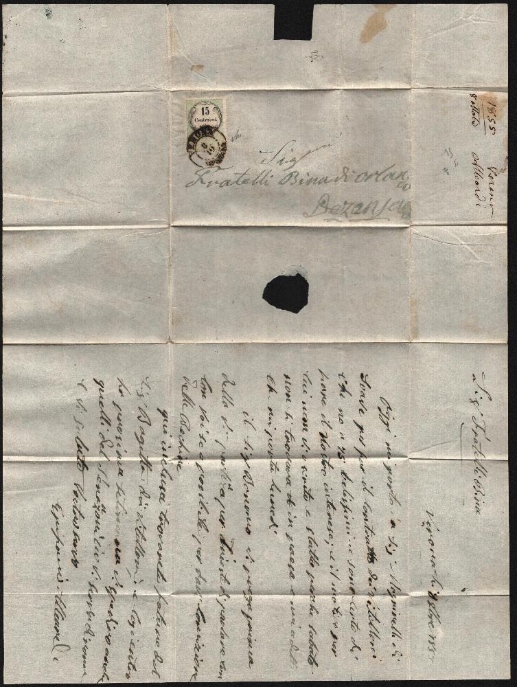 | Zusatzinformationen und Suchstichworte: | Stempelmarke postalisch verwendet. Versuch einer Übersetzung: Lombardo-Venetien, 1. November 1854, Stempelmarke 15 Cent grün und schwarz, typografische Ziffer (Sassone Nr. 3), verwendet als Marke auf einem direkten Brief nach Desenzano, gestempelt mit dem mit der Flamme verzierten Doppelkreisstempel "VERONA 8/10" (Sassone 4 Punkte) im Jahr 1855. Das Set ist in jedem Teil ORIGINAL, hat Originalstempel und die postalisch verwendete Stempelmarke ist perfekt. Für alle Details siehe Fotos. Ich habe den Brief signiert. |