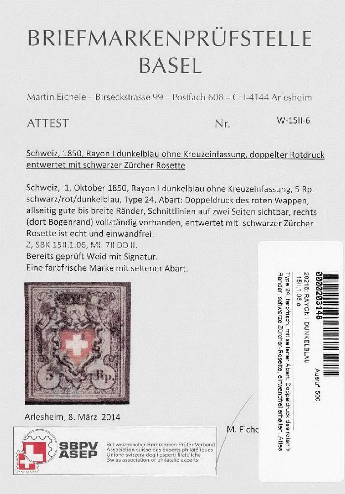 | Zusatzinformationen und Suchstichworte: | 44. Jean-Paul Bach Auktion 13. - 16. Juli 2023 Los 954 Rayon I, dunkelblau ohne Kreuzeinfassung Type 24, farbfrisch, mit seltener Abart: "Doppeldruck des roten Wappen", allseitig gute bis breite Ränder, schwarze Zürcher-Rosette, einwandfrei erhalten. Attest Eichele Ausruf 500,00 CHF |