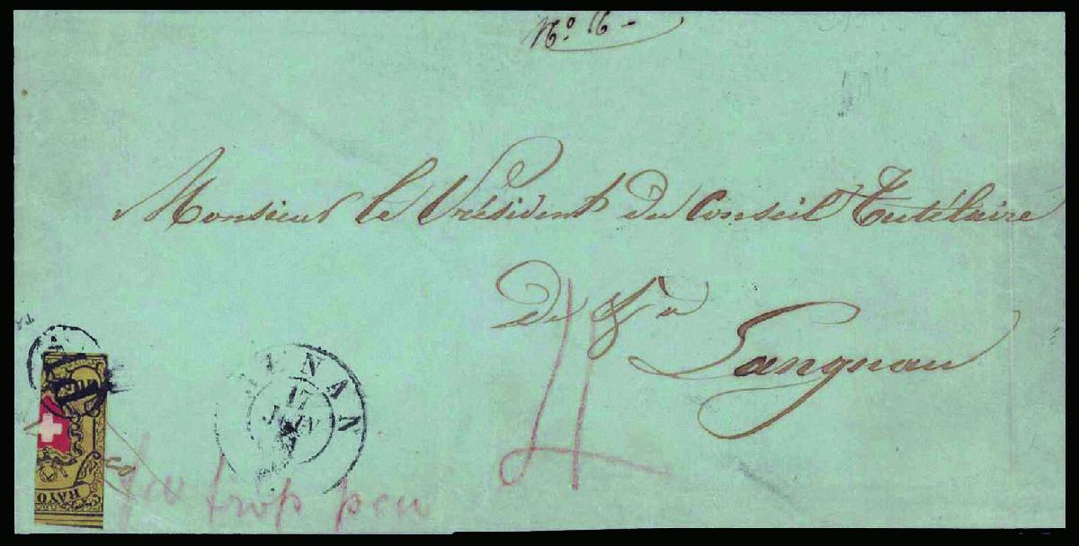 | Zusatzinformationen und Suchstichworte: | 44. Jean-Paul Bach Auktion 13. - 16. Juli 2023 Los 995 Rayon II, gelb, ohne Kreuzeinfassung (STEIN A 2) Type 20, extrem seltene, senkrechte Halbierung, das kleine PP im Oval, AW Nr. 282, ist auf den schönen Brief übergehend, daneben der Aufgabestempel RENAN 17 JUIN 51, handschriftlich mit Rotstift " Franco trop peu und 4 (Kreuzer = 10 Rp.). Sehr seltene Frankatur in fehlerfreier Erhaltung. Attest von der Weid Ausruf 18.000,00 CHF |