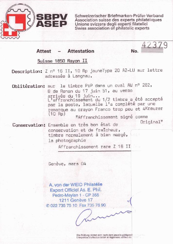 | Prüfer: | von der Weid, Alain (SBPV / ASEP (Schweizerischer Briefmarken-Prüfer-Verband)) |