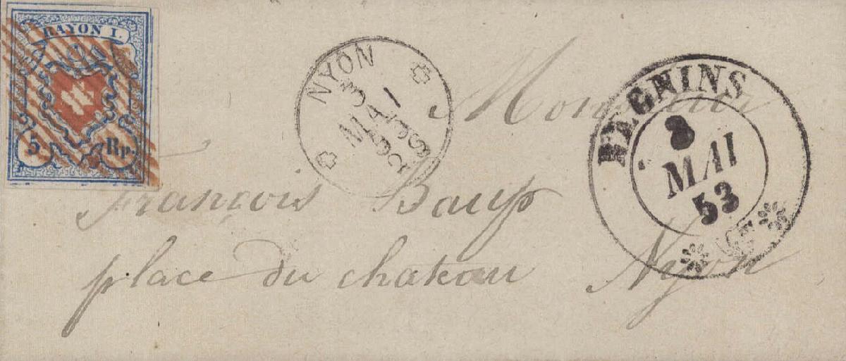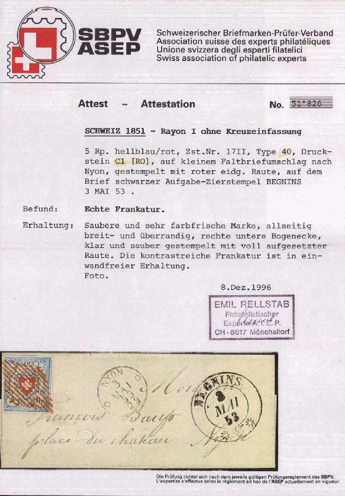 | Zusatzinformationen und Suchstichworte: | 44. Jean-Paul Bach Auktion 13. - 16. Juli 2023 Los 1128 Rayon I, hellblau, ohne KE (STEIN C1) Type 40, sehr farbfrisch, allseitig breitrandig mit grossen Teilen der Schnittlinien, besonders schön aufgesetzte, rote eidg. Raute auf den perfekten Brief übergehend, als Aufgabe-Stempel der grosse Zierstempel BEGNINS 3 MAI 53 und der Ankunftsstempel NYON 3 MAI 53, ein besonders schöner Brief in fehlerfreier Erhaltung. Attest Rellstab Ausruf 1.800,00 CHF |