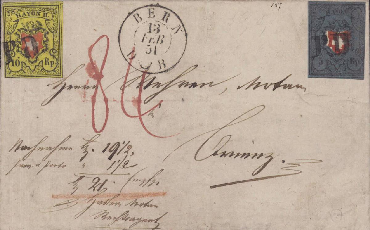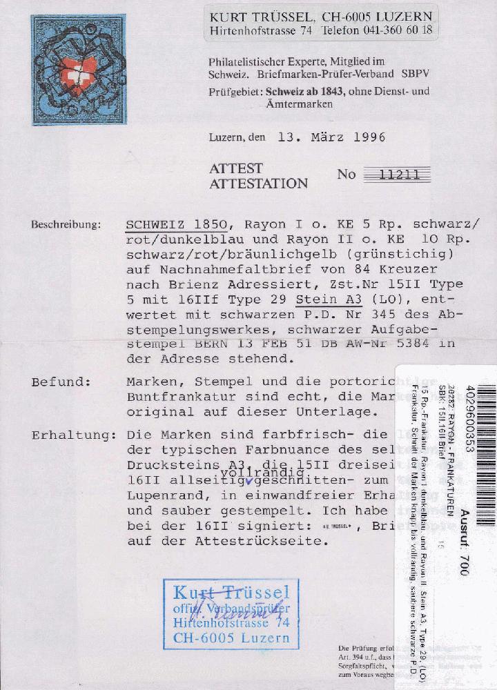 | Zusatzinformationen und Suchstichworte: | 44. Jean-Paul Bach Auktion 13. - 16. Juli 2023 Los 1147 Schweiz Rayon 15 Rp.-Frankatur, Rayon I dunkelblau, und Rayon II, Stein A3, Type 29, LO, sehr farbfrische Frankatur, Schnitt der Marken knapp- bis vollrandig, saubere schwarze P.D., Aufgabe-Stempel BERN 13 FEB 51, schöner NN-Brief nach BRIENZ adressiert. Attest Trüssel Ausruf 700,00 CHF |