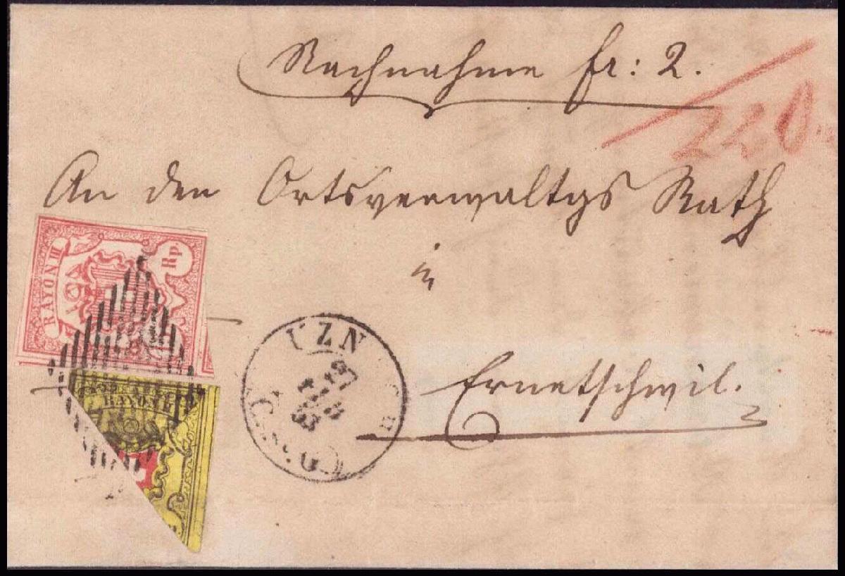 | Zusatzinformationen und Suchstichworte: | 44. Jean-Paul Bach Auktion 13. - 16. Juli 2023 Los 1155 Schweiz Rayon 20 Rp.-Frankatur, eine halbierte 10 Rp. Rayon II, Type 8, Stein E/LU und eine Rayon III, Type 6, farbfrische Frankatur, entwertet mit einer schwarzen, eidg. Raute, sauber auf den Brief übergehend, auch über die Schnittstelle der Halbierung übergehend, Aufgabestempel UZNACH 27 FEB 53, sehr seltene Frankatur in fehlerfreier Erhaltung. Attest von der Weid. Ausruf 24.000,00 CHF |