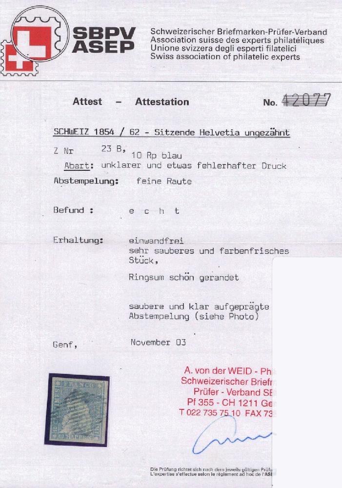 | Prüfer: | von der Weid, Alain (SBPV / ASEP (Schweizerischer Briefmarken-Prüfer-Verband)) |