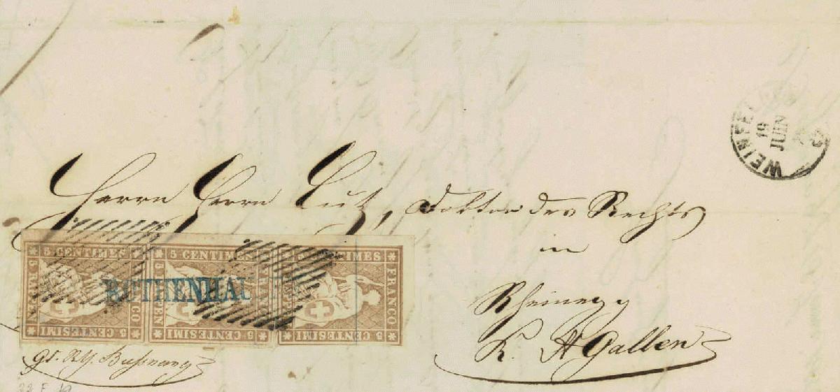 | Zusatzinformationen und Suchstichworte: | 44. Jean-Paul Bach Auktion 13. - 16. Juli 2023 Los 1222 Strubel - B1/B 1. Berner Druck 5 Rp. graubraun, besonders farbfrischer, senkrechter Dreierstreifen, von der linken oberen Bogenecke, mit sehr breiten Rändern links und oben, saubere eidg. Rauten auf den schönen Brief übergehend, zusätzlich zentrischer blauer Stabstempel ROTHENHAUSEN, Aufgabe-Stempel WEINFELDEN 19 JUIN 56, nach RHEINECK adressiert, extrem seltener Dreierstreifen in tadelloser Erhaltung. Sign. von der Weid, Attest Berra. Kat. 10'000.-++ Ausruf 5.000,00 CHF |
