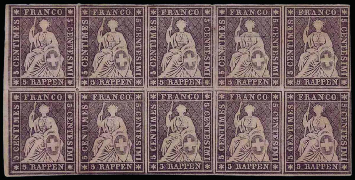 | Zusatzinformationen und Suchstichworte: | 44. Jean-Paul Bach Auktion 13. - 16. Juli 2023 Los 1305 Strubel - B1/B 1. Berner Druck 5 Rp. braun sehr farbfrischer, ungebrauchter 10er-Block mit vollem Gummi, leichte Falzspuren, übliche Gummibüge, eine spektakuläre Einheit in sehr guter Erhaltung. Attest von der Weid 1974 Ausruf 5.800,00 CHF |