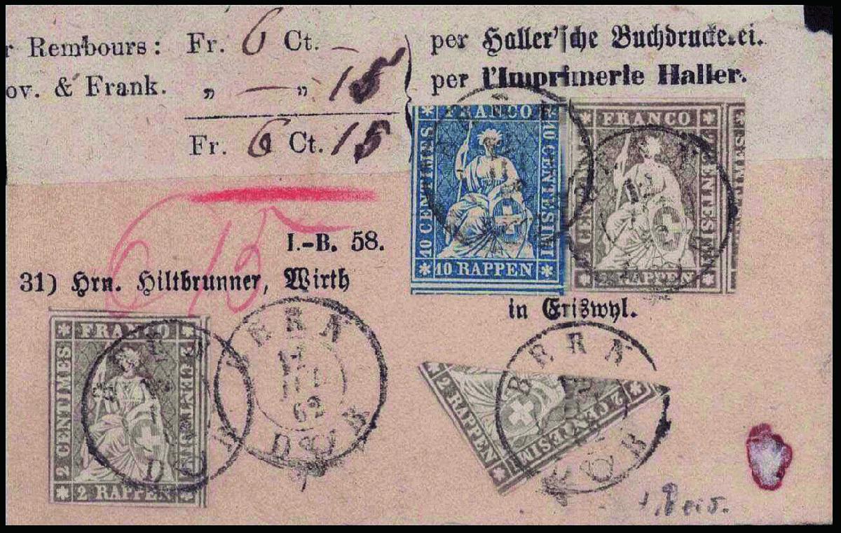 | Zusatzinformationen und Suchstichworte: | 44. Jean-Paul Bach Auktion 13. - 16. Juli 2023 Los 1351 Strubel Frankaturen 15 Rp.-Frankatur, 2 Stück 2 Rp. und eine halbierte 2 Rp., dazu eine 10 Rp., sehr farbfrische Marken mit teils etwas unterschiedlichem Schnitt, saubere Datum-Stempel BERN 12 JUIL 62, schönes NN-Streifband über HUTWYL nach ERISWYL adressiert, extrem seltene Frankatur. Attest von der Weid 2003 Ausruf 10.000,00 CHF |