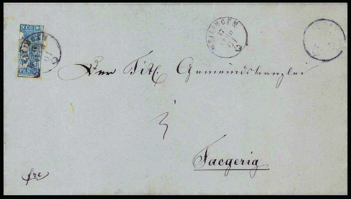 | Zusatzinformationen und Suchstichworte: | 44. Jean-Paul Bach Auktion 13. - 16. Juli 2023 Los 1366 Strubel Frankaturen 5 Rp.-Frankatur mit einer senkrecht halbierten 10 Rp.-Strubel, lebhaftpreussischblau, rechte Hälfte mit breiten Rändern, rechts und unten, oben nicht störend getroffen, sauberer Fingerhutstempel MELLINGEN 17 AVRIL 61 auf den vollständigen Brief übergehend, der Stempel ist rechts auf dem Brief wiederholt, der Brief wurde in NIEDERWIL am 16. April 1861 geschrieben und nach TÄGERIG adressiert. 5 Rp.-Porto für einen Brief im 1. Briefkreis, gültig ab 1. Januar 1852. Gemäss rückseitiger Notiz 1913 vom Gerichtsarchiv BREMGARTEN erstanden und begleitet von der Notiz Dr. Stiner mit dem Verkaufspreis von 50 Fr. Eine sehr seltene, behelfsmässige Frankatur. Diese stammt noch aus der Zeit vor dem ausdrücklichen Halbierungsverbot vom 7. August 1862. Attest Eichele Ausruf 5.500,00 CHF |