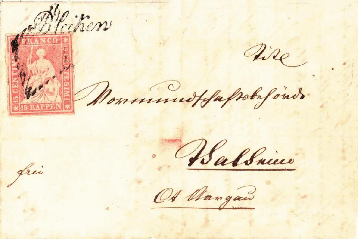 | Zusatzinformationen und Suchstichworte: | 44. Jean-Paul Bach Auktion 13. - 16. Juli 2023 Los 1368 Strubel Frankaturen 1856, 15 Rp. rötlichkarmin, mit Klischeefehler SH 3.08 (farbloser Strich links des M von Centesimi), sehr guter Markenschnitt, allseitig weissrandig, mit schwarzer Raute kopffrei entwertet, daneben Schreibschrift-Abgangsstempel BLEIKEN (Gr. 49) auf Kleinbrief nach Thalheim, in fehlerfreier Erhaltung. Attest Hermann Ausruf 400,00 CHF |