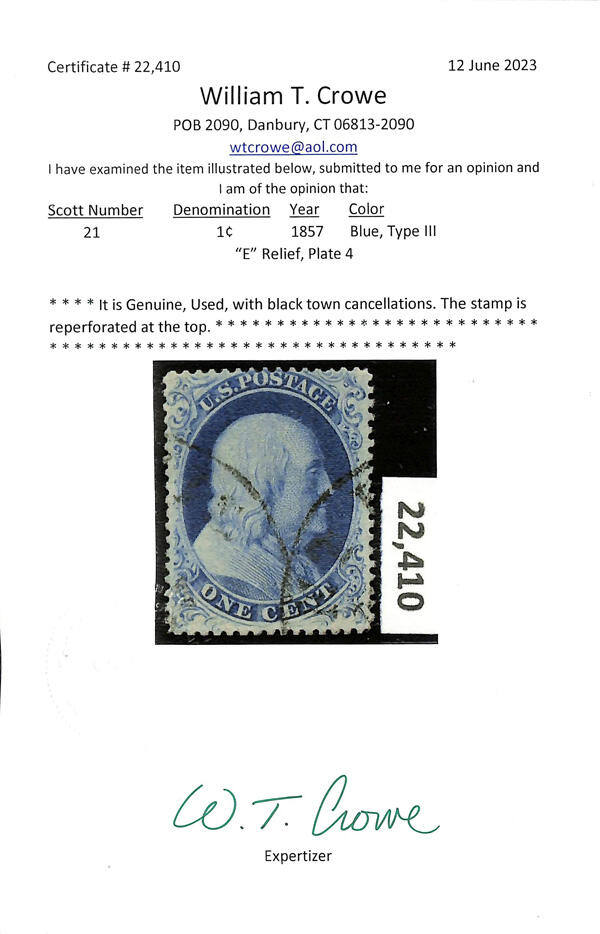 | Zusatzinformationen und Suchstichworte: | Kelleher 784. Auktion 19. Juli 2023 Los 4021 USA 1857-61 Ausgabe 1857,1¢ blau, type III (Scott 21), "E" relief, Platte 4, ein Blickfang mit satter, tiefer Farbe und scharfen Details; drei klare Ränder mit schwarzen Ortsstempeln; oben nachgezähnt, feinst bis Pracht wirkend, mit 2023 Crowe Attest. Scott $1,400 Zuschlag 350,00 USD |
