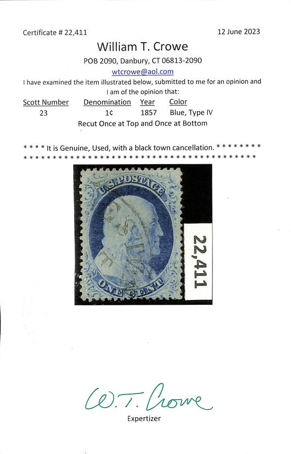 | Zusatzinformationen und Suchstichworte: | Kelleher 784. Auktion 19. Juli 2023 Los 4023 USA 1857-61 Ausgabe 1857,1¢ blau, type IV (Scott 23), nachgraviert einmal oben und einmal unten, frisch und frisch gedruckt, ordentlich mit zarter Ortsstempel innerhalb herrliche gleichmäßig gerandet, Pracht, mit 2023 Crowe Attest. Scott $550 Zuschlag 425,00 USD |