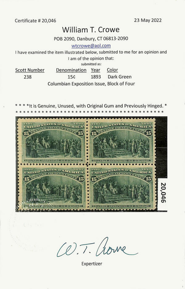 | Zusatzinformationen und Suchstichworte: | Kelleher 784. Auktion 19. Juli 2023 Los 551 USA 1893 Kolumbus Ausgabe 1893,15¢ columbianische (Scott 238), Originalgummi, Hauch einer Falzspur (sieht aus, wie postfrisch), mit stark, sauber Farbe auf hellem Papier, feinst bis Pracht, mit 2022 Crowe Attest für Viererblock, diese Position 3. Scott $200 Ausruf 75,00 USD |
