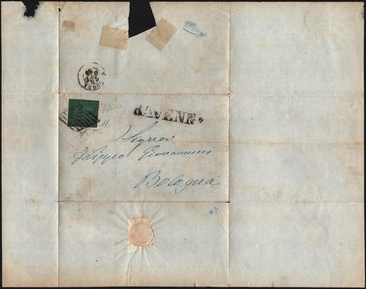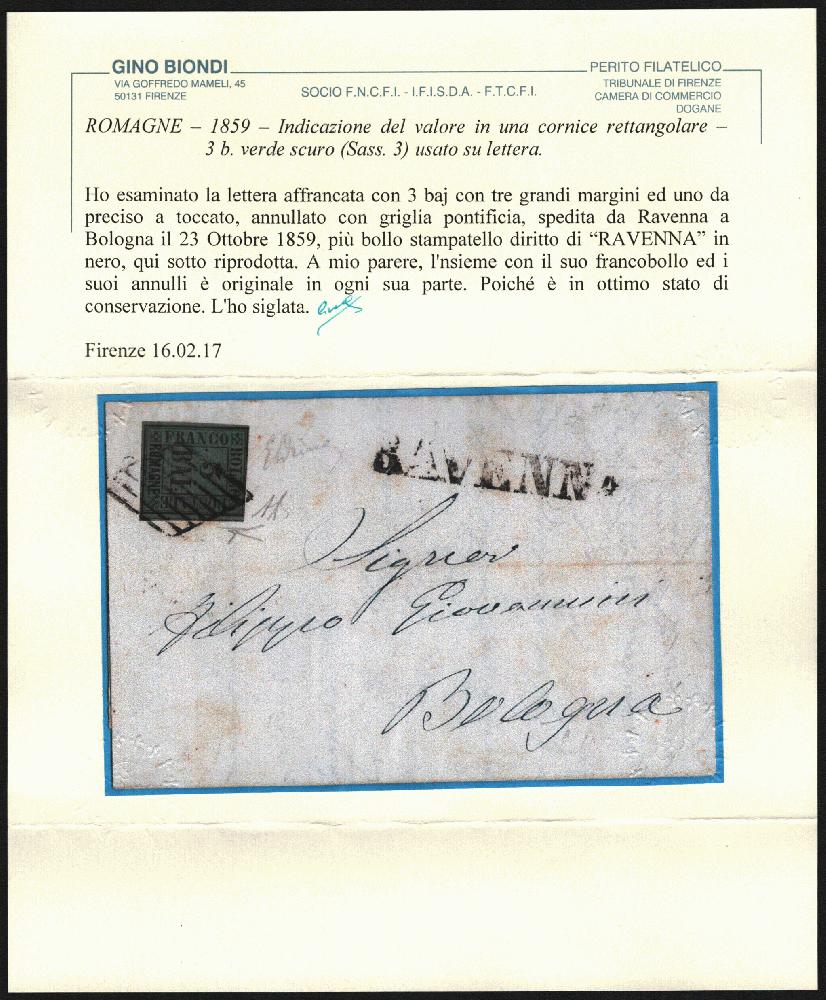 | Zusatzinformationen und Suchstichworte: | Versuch einer Übersetzung: ROMAGNA - 1859 - Angabe des Wertes in einem rechteckigen Rahmen - 3 b. dunkelgrün (Sass. 3) auf Brief verwendet. Ich habe den Brief mit 3 Baj mit drei großen Rändern und einem von präzise bis berührt frankiert, mit päpstlichem Gitter entwertet, der am 23. Oktober 1859 von Ravenna nach Bologna geschickt wurde, sowie den Stempel von "RAVENNA" rechts in Schwarz, der unten wiedergegeben ist, geprüft. Meiner Meinung nach ist das Ganze mit seiner Briefmarke und seinen Entwertungen in allen Teilen original. Da es in sehr gutem Zustand ist, habe ich signiert. Florenz 16.02.17 |