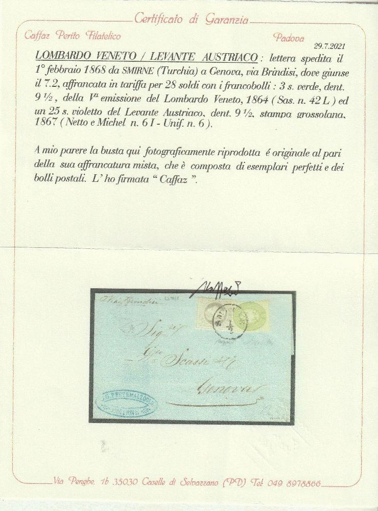 | Zusatzinformationen und Suchstichworte: | Tuscanphila 1. Auktion 23. September 2023 Los 39 Österreich Lombardei Venetien 1868 1 Feb Mista 25 s. + 3 s. Michel n.6I + Unif.6 su frasca busta da Smirne x Genova Cert.Caffaz+Ferchnbauer f.Giulio Bolaffi rara e Spl Ausruf 800,00 EUR |