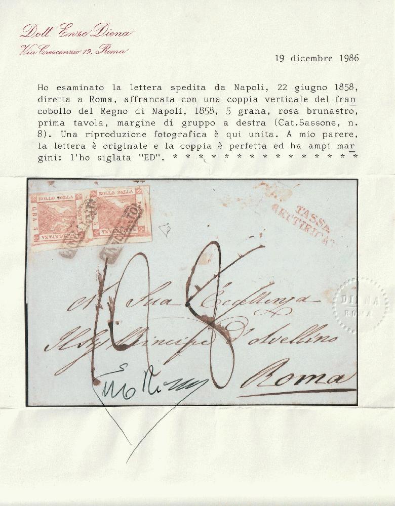 | Zusatzinformationen und Suchstichworte: | Tuscanphila 1. Auktion 23. September 2023 Los 55 Italien Staaten Neapel 1858 22 Giu 5 gr. Coppia con filigrana Giglio completo Sassone 8 Bdf su sovracoperta da Napoli x Roma "Tassa Rettificata" da 8 a 12 baj Cert.ED Ex Coll. Imperato rara e Spl Ausruf 350,00 EUR |