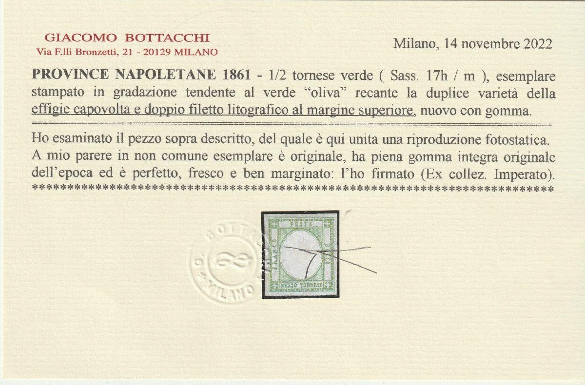 | Zusatzinformationen und Suchstichworte: | Tuscanphila 1. Auktion 23. September 2023 Los 74 Italien Staaten Neapel 1/2 t. verde Effgie Capovolta con Filetto in alto Sassone 17h+17m grandi margini integro MNH** Cert.Bott+Ray Ex Coll. Imperato doppia varietà pressochè unica e di eccezionale qualità Ausruf 1.000,00 EUR |