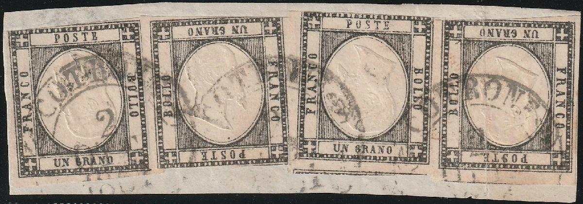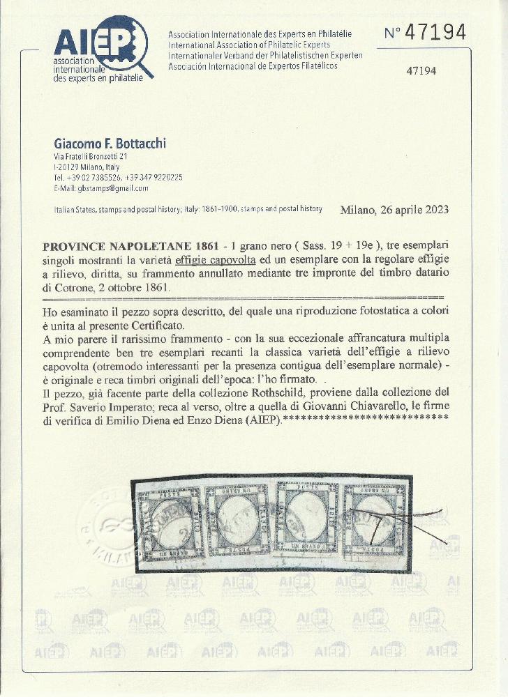 | Zusatzinformationen und Suchstichworte: | Tuscanphila 1. Auktion 23. September 2023 Los 80 Italien Staaten Neapel 1 gr. + 1 gr. x 3 val. Effige Capovolte Sassone 19+19e usati su framm. Crotone Cert.AIEP Bott, ED f.esteso Chiav.Em.D Ex Coll. Rothschild ed Imperato Rarità Ausruf 3.000,00 EUR |