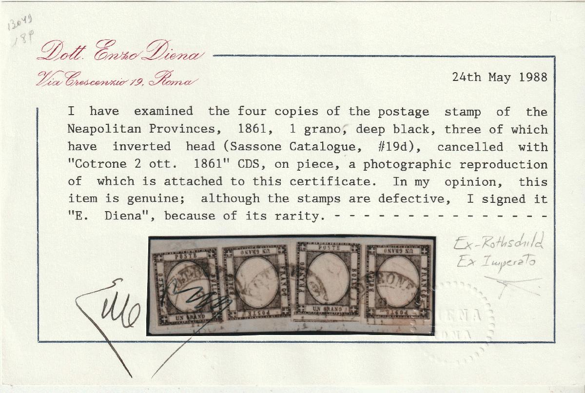 | Zusatzinformationen und Suchstichworte: | Tuscanphila 1. Auktion 23. September 2023 Los 80 Italien Staaten Neapel 1 gr. + 1 gr. x 3 val. Effige Capovolte Sassone 19+19e usati su framm. Crotone Cert.AIEP Bott, ED f.esteso Chiav.Em.D Ex Coll. Rothschild ed Imperato Rarità Ausruf 3.000,00 EUR |