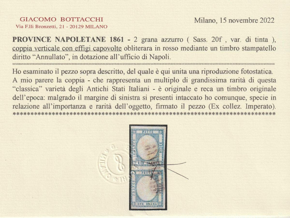 | Zusatzinformationen und Suchstichworte: | Tuscanphila 1. Auktion 23. September 2023 Los 93 Italien Staaten Neapel 2 gr. Effigie Capovolta coppia verticale Sassone 20f usata con Annullato non in cartella rossastro Cert.Bott, Em.D 1941 Rarità unica con questo annullo Ausruf 300,00 EUR |