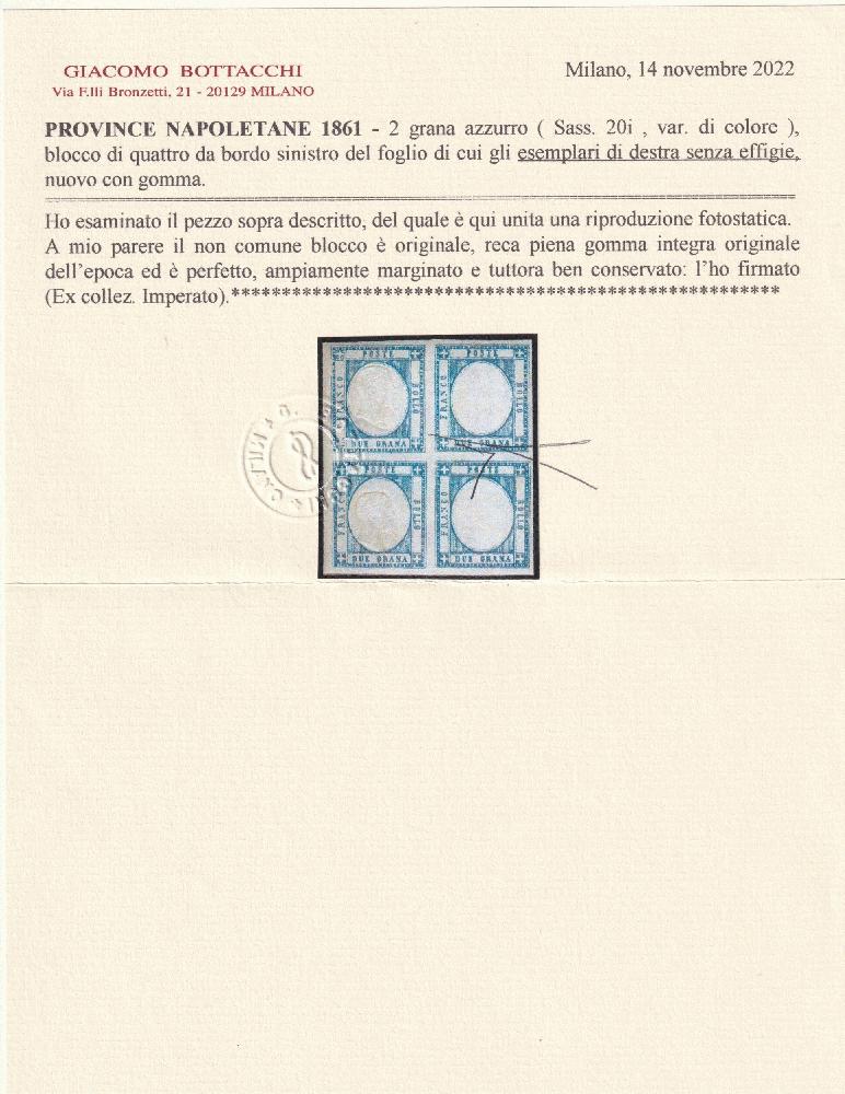 | Zusatzinformationen und Suchstichworte: | Tuscanphila 1. Auktion 23. September 2023 Los 103 Italien Staaten Neapel 2 gr. azzurro 2 coppie con e Senza Effigie in quartina Sassone 20i Bdf grandi margini MNH** Cert.Bott. F.ed, Colla Ex Coll. Imeperato molto rara e lusso. Prezzo di catalogo: 20000 Ausruf 1.250,00 EUR |