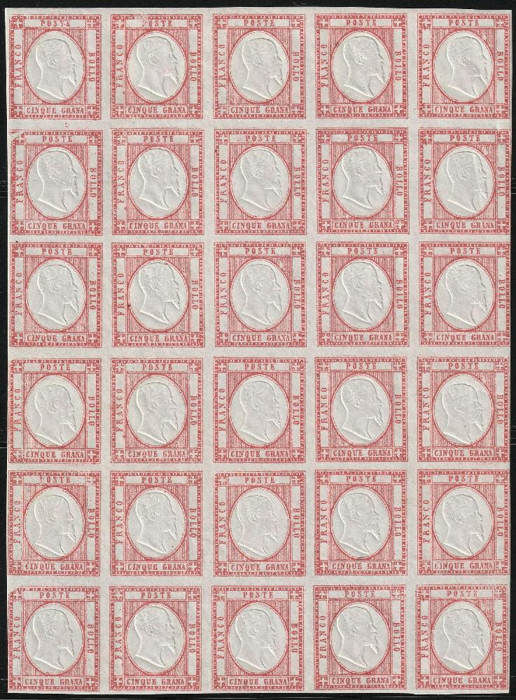 | Zusatzinformationen und Suchstichworte: | Tuscanphila 1. Auktion 23. September 2023 Los 107 Italien Staaten Neapel 5 gr. rosa lilla Tavola Modificata Blocco di 30 con Filetti e angoli rotti Sassone 21-21n+VAR integro MNH** Cert.Bott f.A.Bolaffi Ex Coll. Imperato Rarità lusso UNICO Ausruf 5.000,00 EUR |