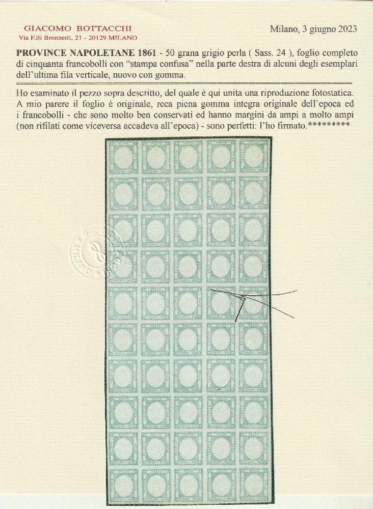 | Zusatzinformationen und Suchstichworte: | Tuscanphila 1. Auktion 23. September 2023 Los 130 Italien Staaten Neapel 50 gr. grigio perla Foglio Completo di 50 non rifilato Sassone 24 ben marginato MNH** freschissimo Cert.Bottacchi f. Giulio Bolaffi Ex Coll. Imperato Eccezionale tra/il migliori/e noti/o Ausruf 4.000,00 EUR |
